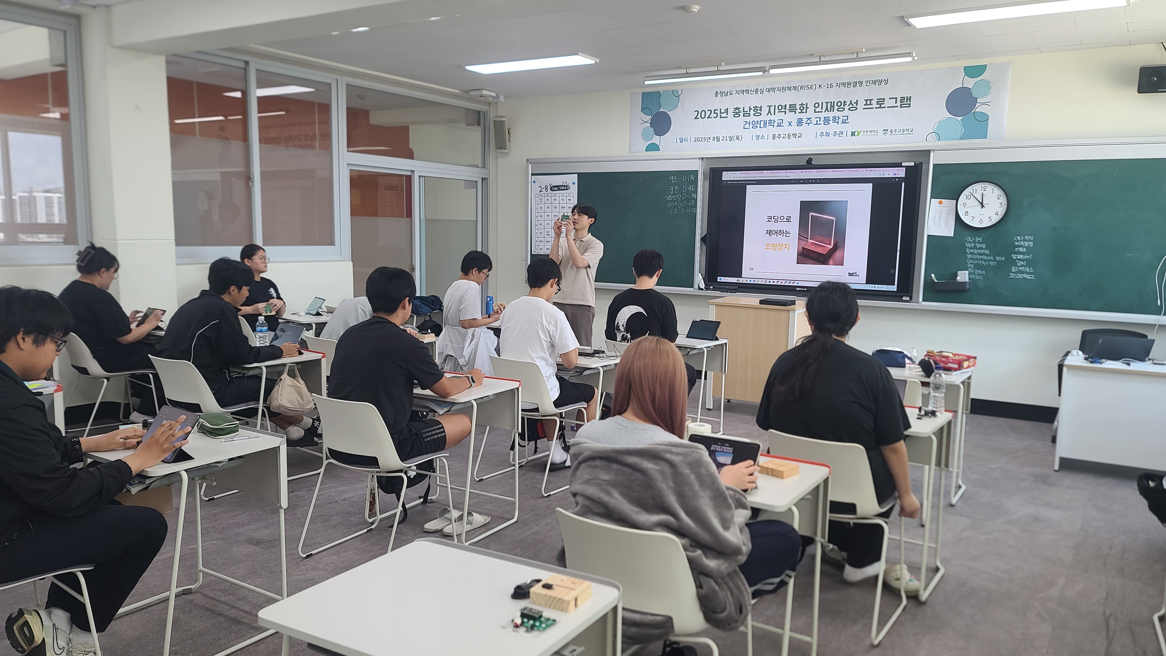 각 학교의 교육 수요와 특성에 맞춘 맞춤형 커리큘럼이 특징이다. 홍주고등학교에서는 AI·SW 역량 강화에 중점을 두고 ▲공공 데이터 활용 경진대회 ▲지구 온도를 낮추는 데이터 이야기 ▲치즈스틱을 활용한 스마트장치 만들기 ▲할로코드와 함께하는 사물인터넷 ▲아두이노로 만드는 스마트조명 등 5개 세부 교과과정을 운영했다. 건양대학교 SW중심대학 소속 강사들이 수업을 주도하고 인공지능학과 교수진이 첨삭 및 피드백을 제공하며 학습 완성도를 높였다.