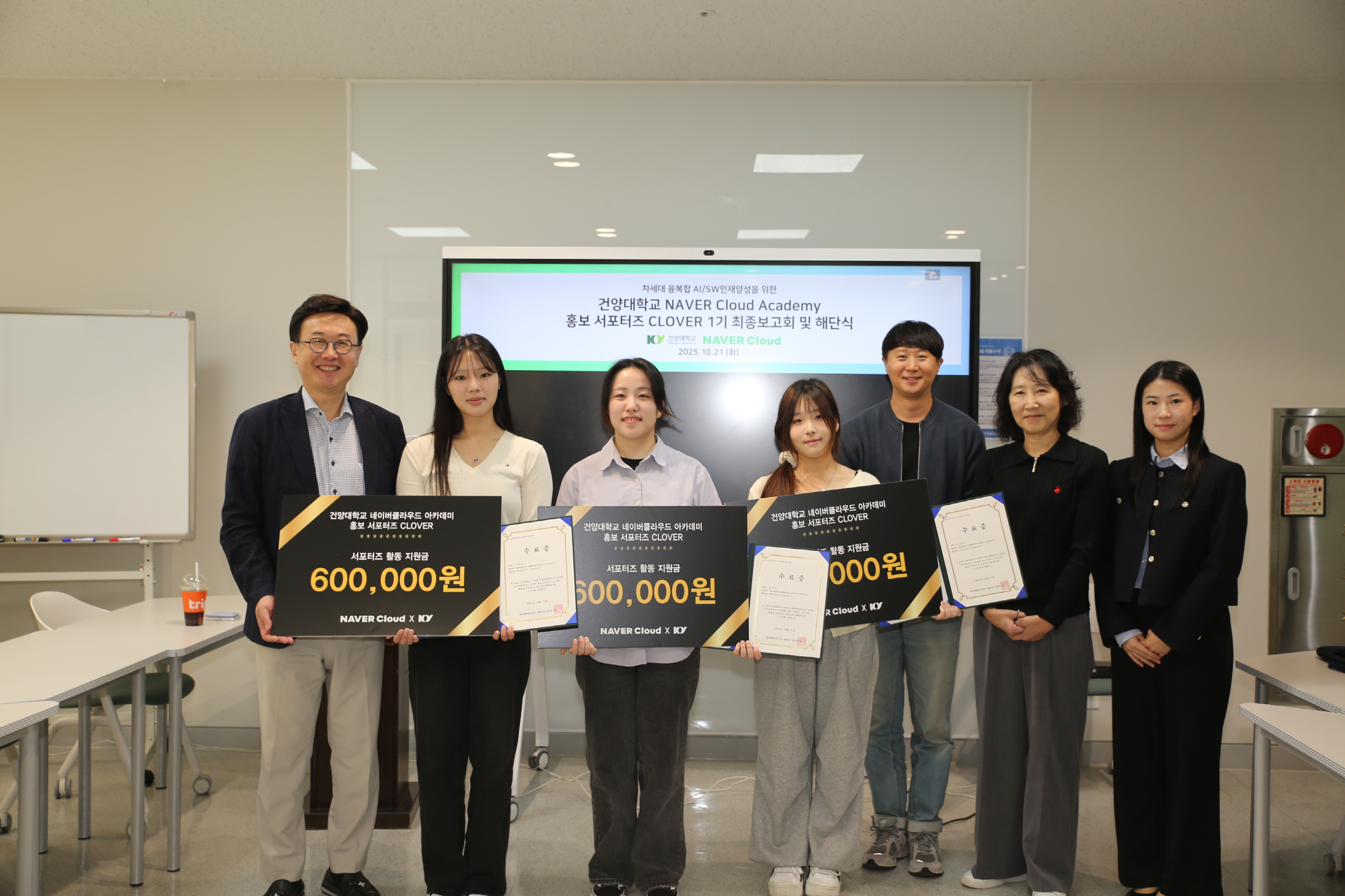 건양대학교(총장 김용하) SW중심대학사업단(단장 김용석)은 지난 10월 21일 메디컬캠퍼스에서 ‘네이버클라우드 아카데미 홍보 서포터즈 CLOVER 최종 보고회 및 해단식’을 개최했다. 이번 행사는 차세대 융복합 AI·SW 인재 양성을 위한 산학 협력 프로그램의 일환으로, 지난 8월 발대식 이후 약 2개월간 활동한 서포터즈들의 성과를 공유하는 자리였다.
