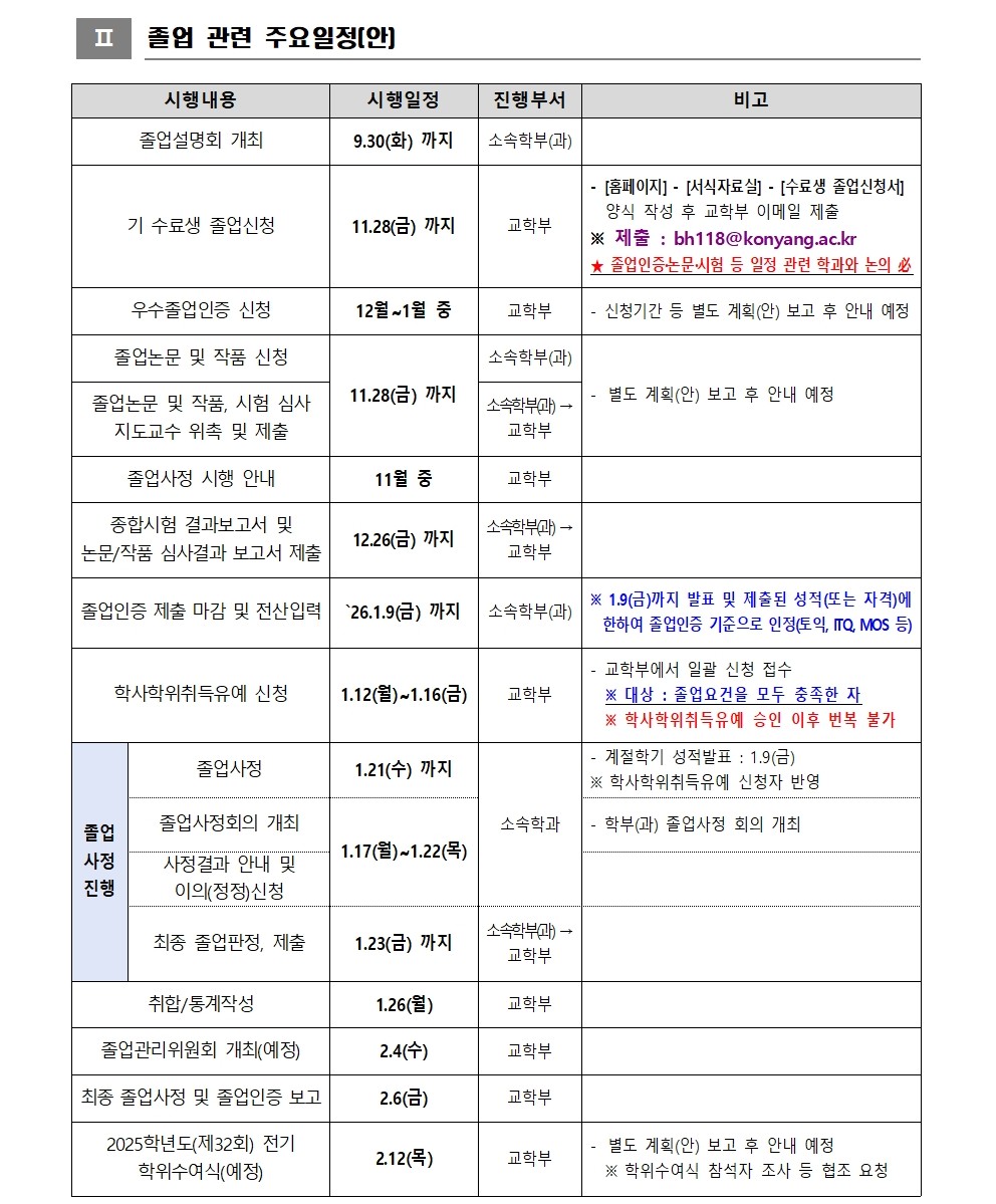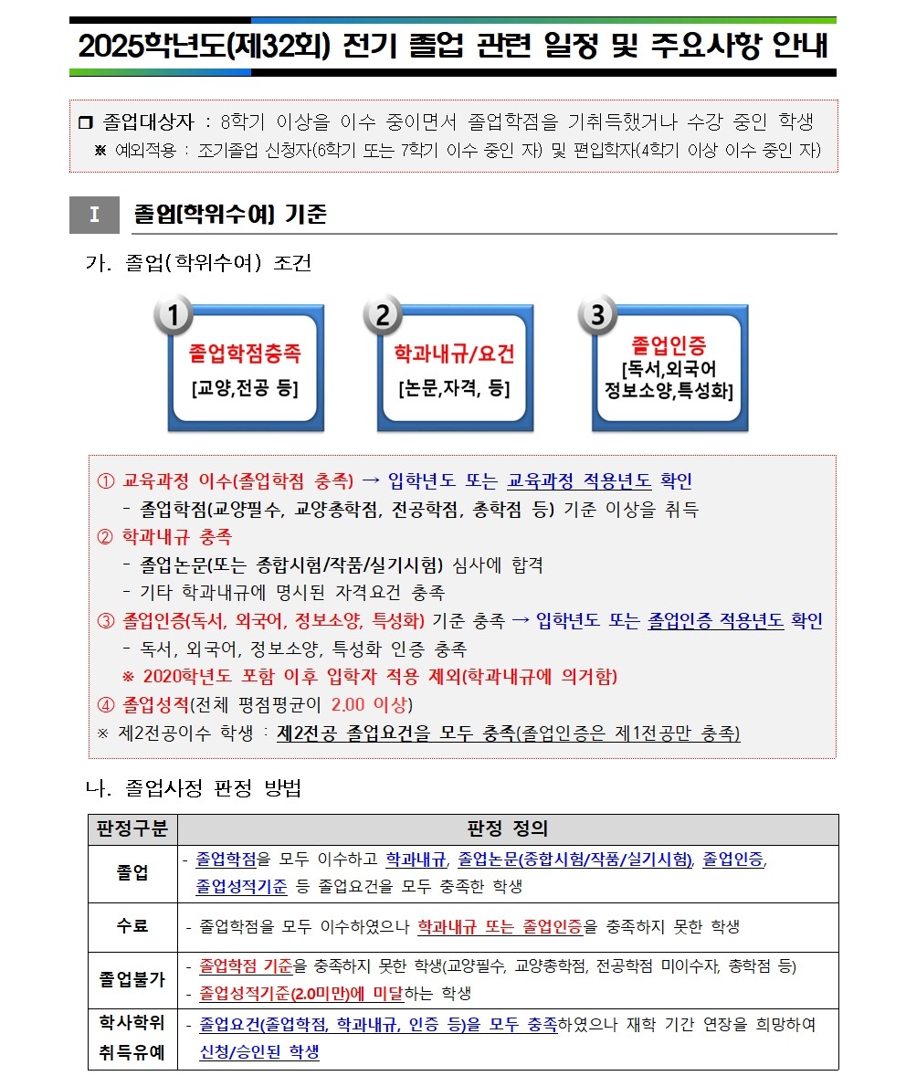 | 제목 | 2025학년도(제32회) 전기 졸업사정 일정 및 주요사항 안내 | ||||