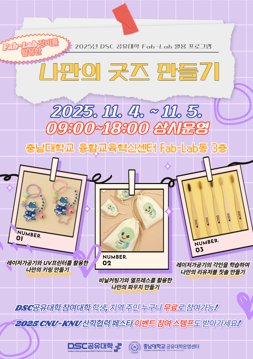 | 제목 | 2025년 DSC 공유대학 Fab-Lab 활용 교육프로그램 안내(11.4~11.5, 충남대학교) | ||||