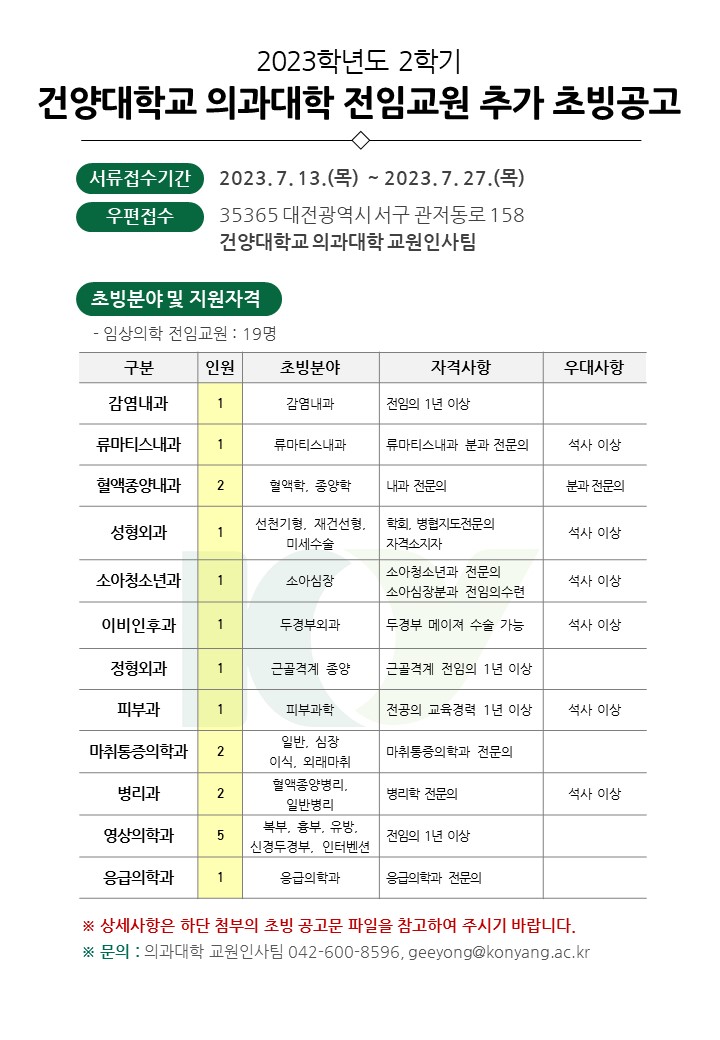 | 제목 | 2023학년도 2학기 건양대학교 의과대학 교원 추가 초빙공고 | ||||