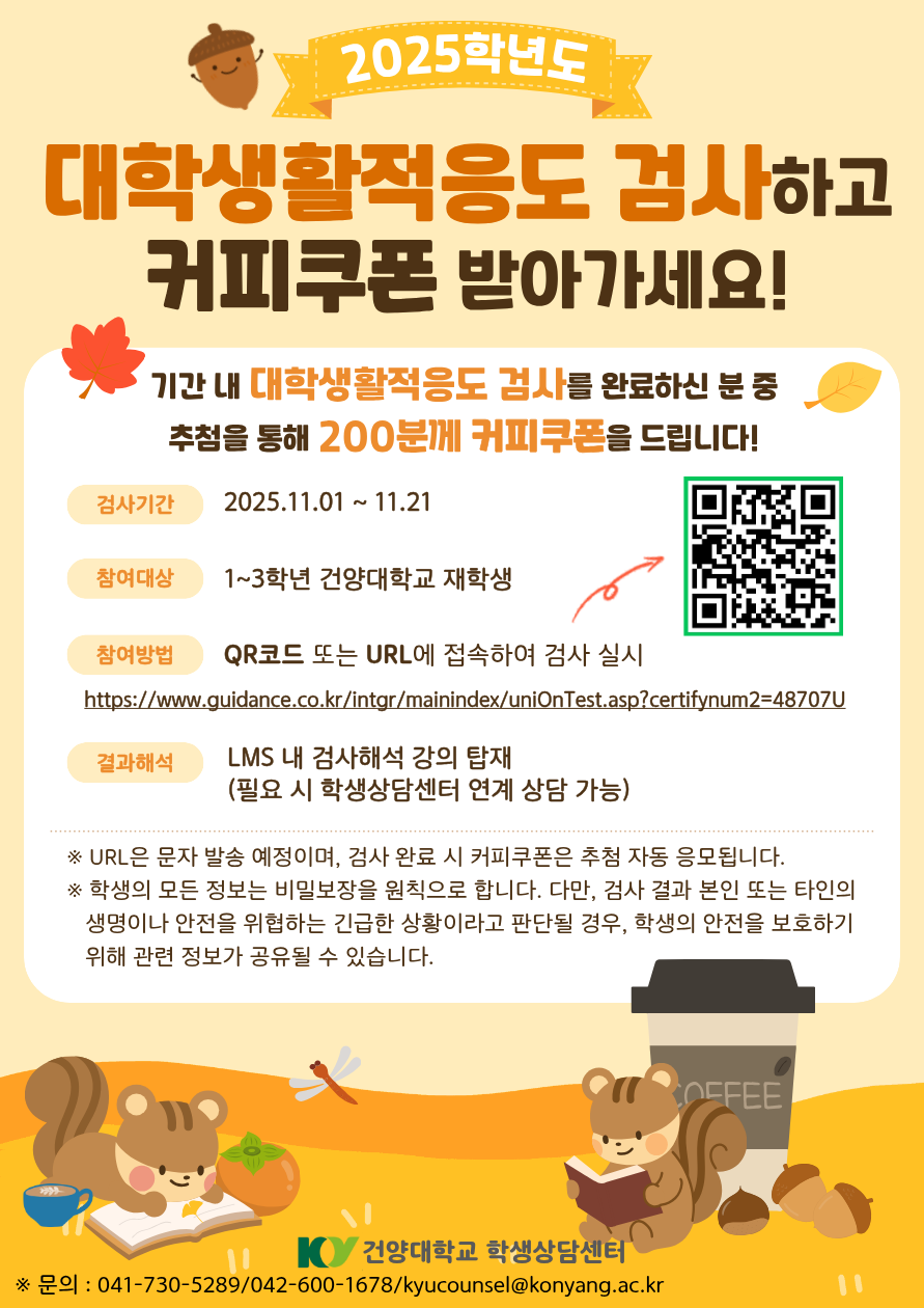 1. 검사안내 - 검사목적 : 대학 생활 적응 수준 확인 및 자기 이해 심화 - 참여대상 : 건양대학교 재학생 1~3학년 - 검사기간 : ~11월 21일(금)까지 - 참여방법 : QR 또는 URL 접속하여 검사 실시 (URL : https://www.guidance.co.kr/intgr/mainindex/uniOnTest.asp?certifynum2=48707U) 2. 참여 이벤트 검사 기간 내에 설문을 완료하신 분 중 추첨을 통하여 200분께 커피 쿠폰을 증정할 예정입니다. ※ 문의 : 041-730-5289/042-600-1678/kyucounsel@konyang.ac.kr |