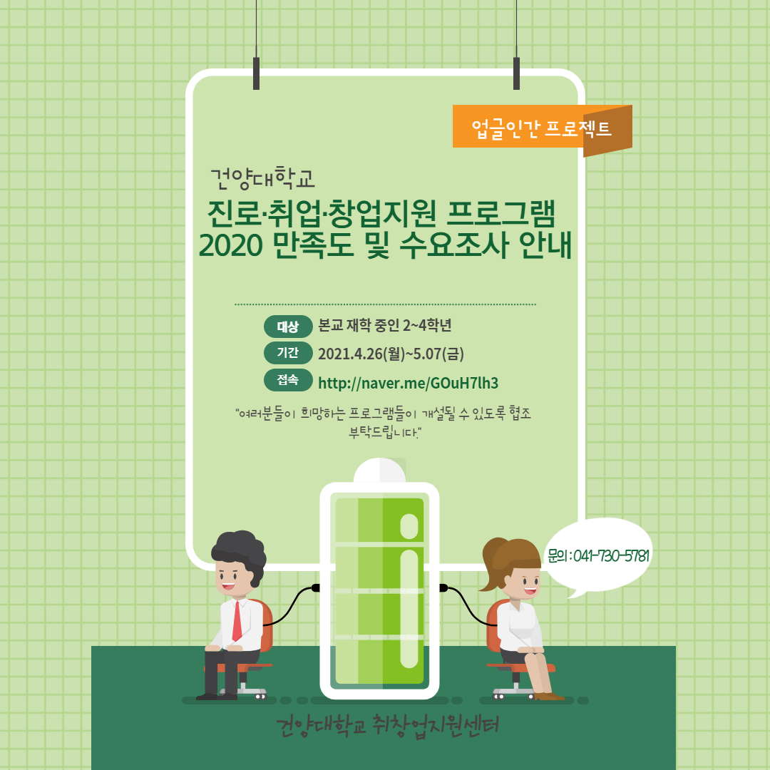 진로·취업·창업 지원 관련 2020 만족도 및 2021 수요조사를 진행합니다. 설문조사를 통해 2020년도 프로그램의 부족한 부분을 개선하고, 2021년도 프로그램 운영시 활용할 예정이오니 소중한 의견을 부탁드립니다 1.조사기간 : 2021년 4월 26일 월요일 ~ 5월 11일 화요일 2.조사분야 : 진로·취업·창업 지원 프로그램 만족도 및 수요조사 3.조사대상 : 건양대학교 2~4학년 재학생(2021학년도 기준) 4.조사방법 : 온라인 설문(PC 및 모바일 참여 가능) 5.URL주소 : http://naver.me/GOuH7lh3