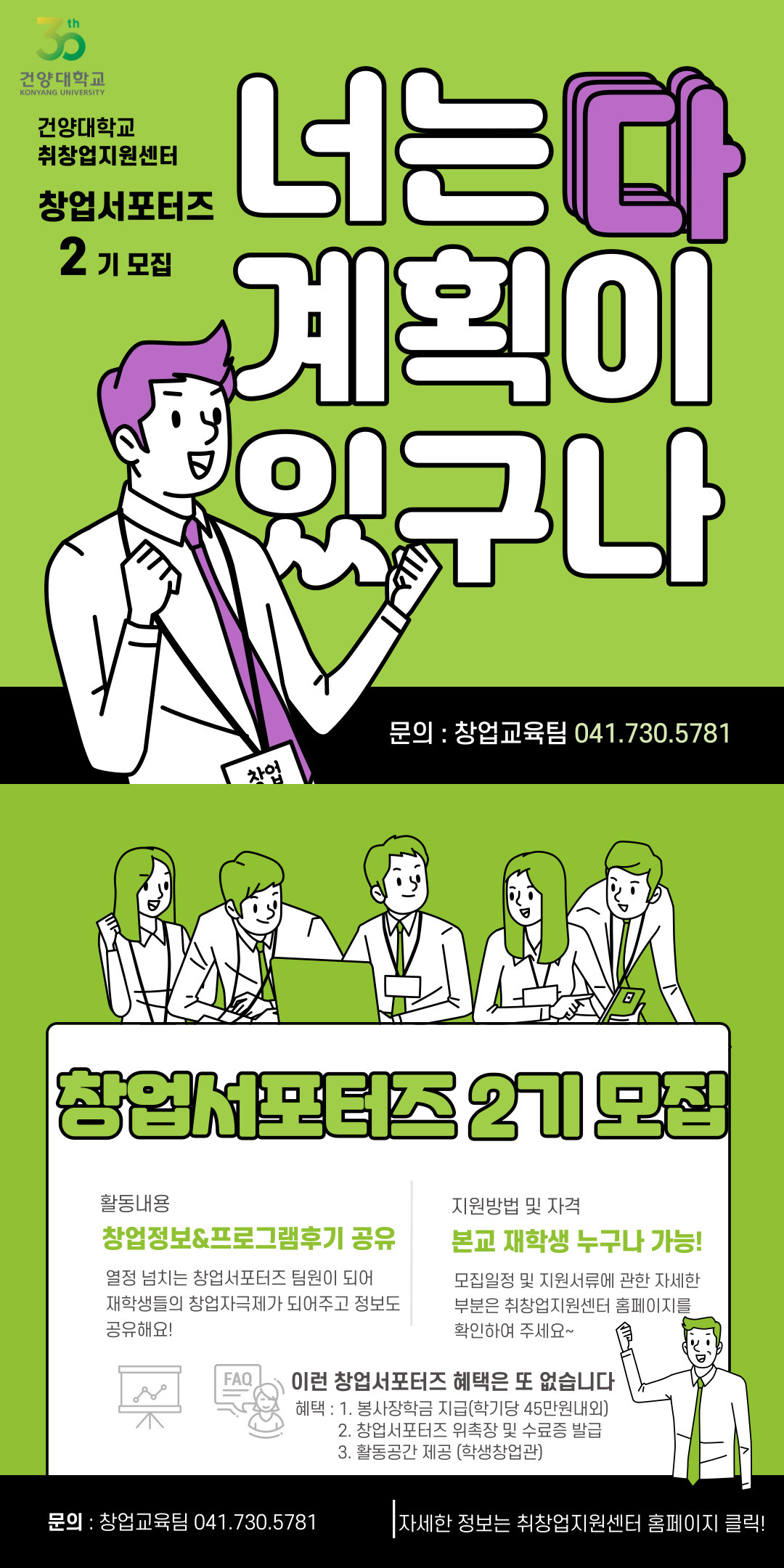 창업교육팀에서 창업 서포터즈 2기를 모집합니다 ^^ 열정넘치는 재학생 여러분들의 많은 참여 바랍니다.