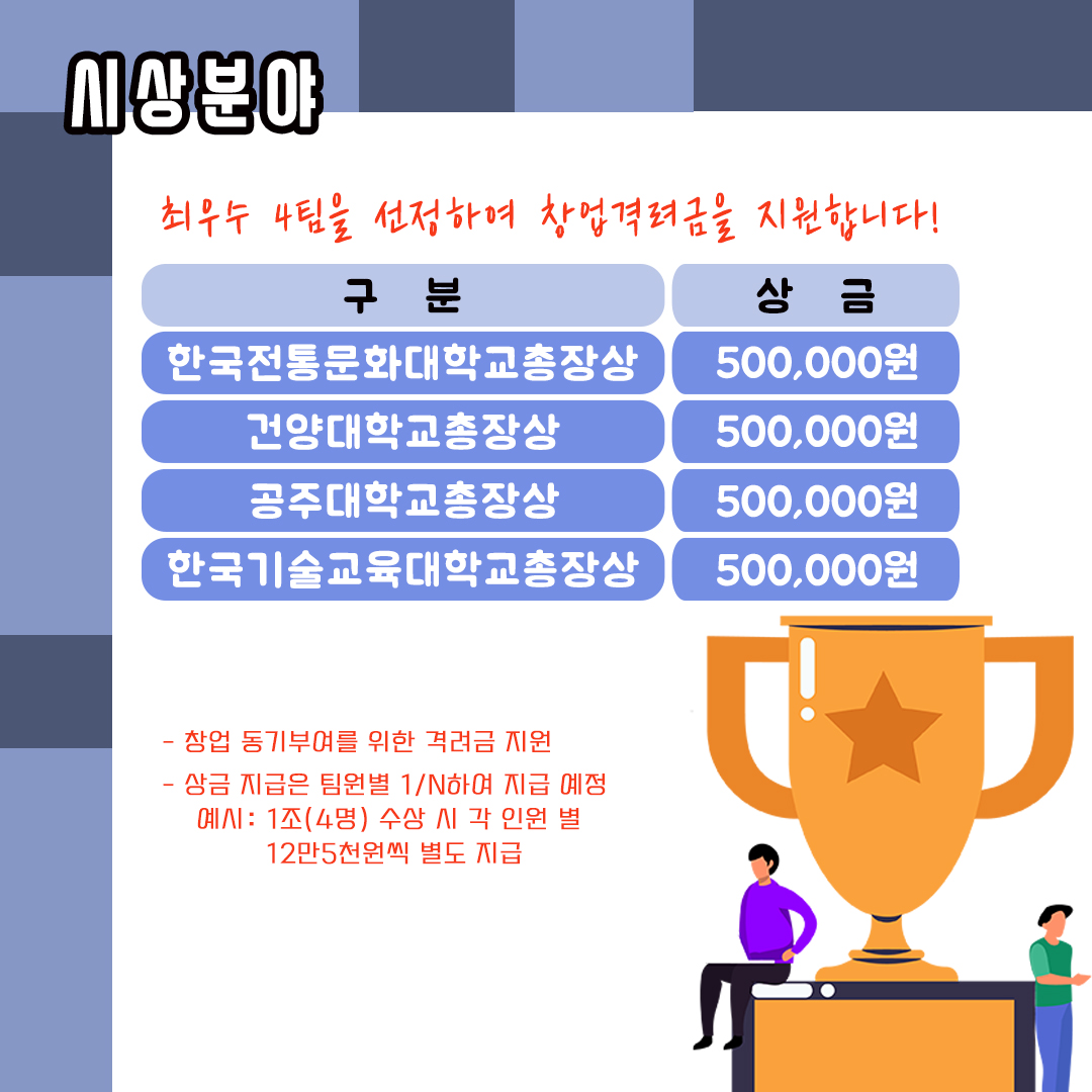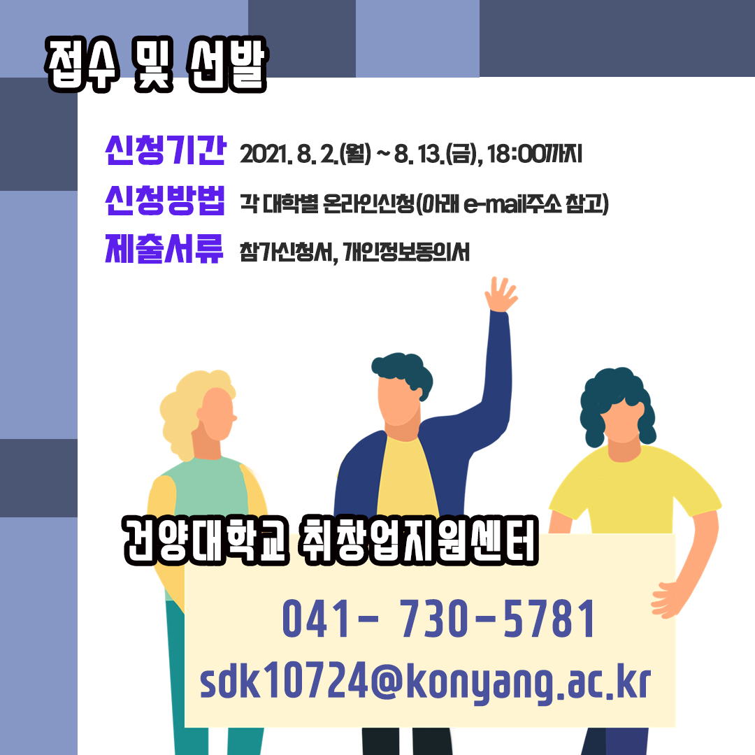 8월 23일과 24일 충남권 4개 대학연합 창업캠프가 진행됩니다 관심있는 여러분의 많은 신청 바랍니다 가. 프로그램 : 충남권 4개 대학연합「문화‧기술‧바이오‧콘텐츠」 프리스타트업 캠프 나. 운영기간 : 2021.08.23.(월) ~ 08.24(화), 1박 2일 다. 운영방법 : 실시간 비대면(Zoom프로그램)으로 진행 라. 운영대상 : 총 40명 참여 (참여 4개교 재학생 각 10명) 마. 운영내용 : 충청권 4개교(건양대, 공주대, 한국기술교육대, 한국전통문화대)