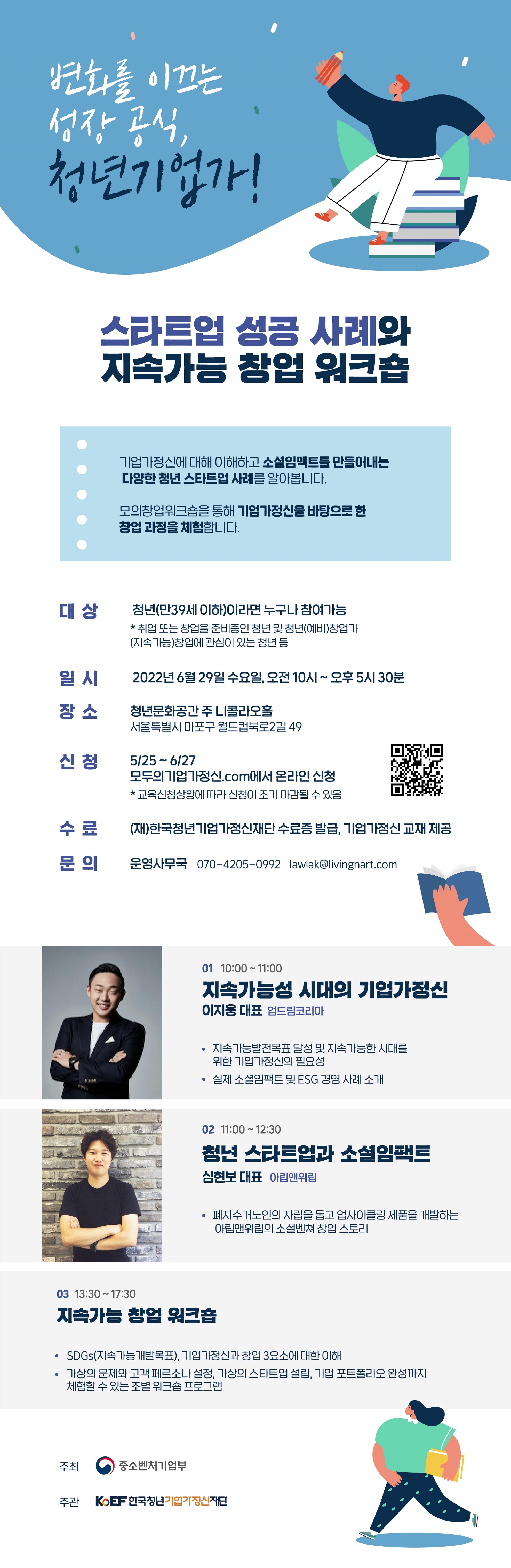 중소벤처기업부와 (재)한국청년기업가정신재단은 청년들의 기업가정신 함양 및 창업 문화 확산을 위해 청년을 대상으로 한 기업가정신 교육을 운영하고자 합니다.
