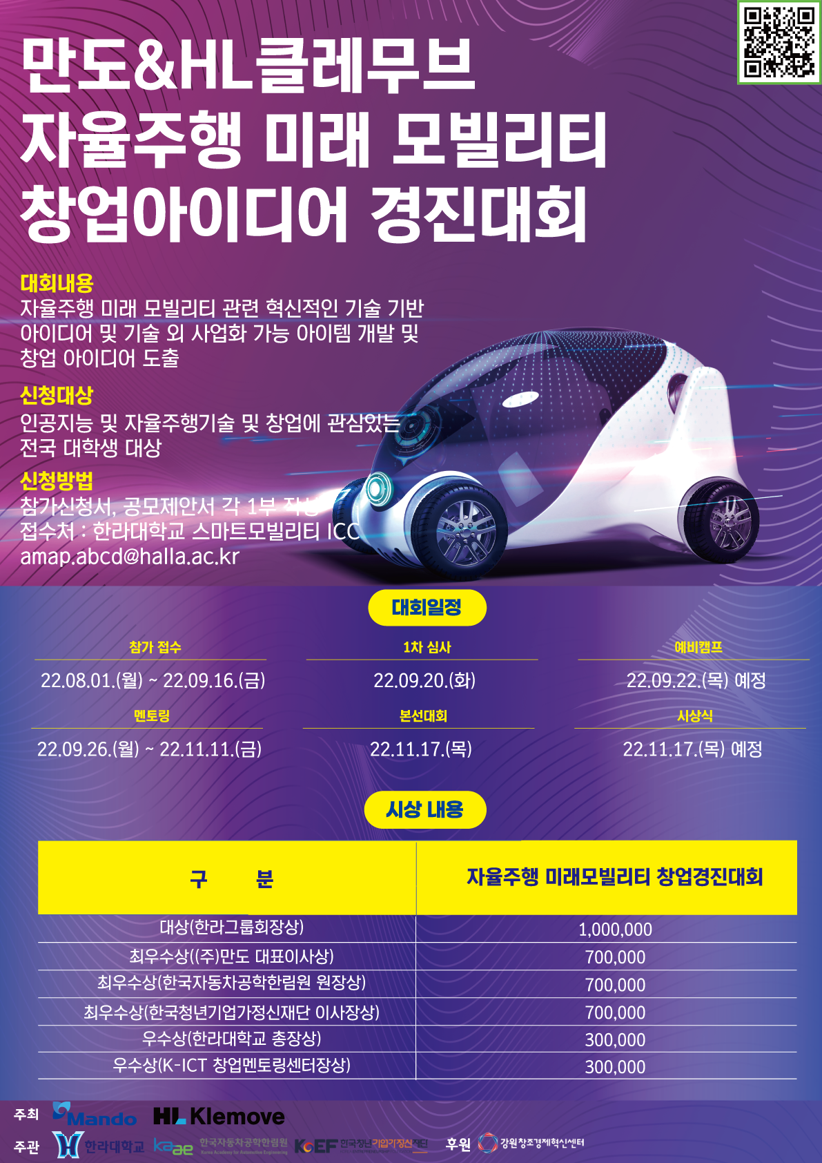 | 제목 | 2022 만도_HL클레무브 자율주행 미래 모빌리티 창업아이디어 경진대회 | ||||