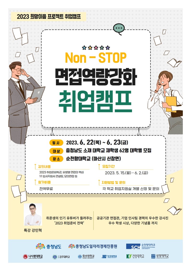 1. 프로그램명 : 2023 희망이음 프로젝트 면접역량강화 취업캠프 2. 내용 : 개인별 면접 준비도를 바탕으로한 효과적인 면접 집중 캠프 진행 공기업/대기업 등 유형별 면접 실습/ 인사담당자 모의면접 3. 장소 : 순천향대학교 4. 모집대상 : 건양대학교 재학생 7명 5. 신청기간 : ~06. 02(금) 6. 신청방법 : 신청서(첨부) 작성 후 취창업지원센터 제출(041-730-5155) (방문)이노비전센터 102호/ (메일)hope@konyang.ac.kr |