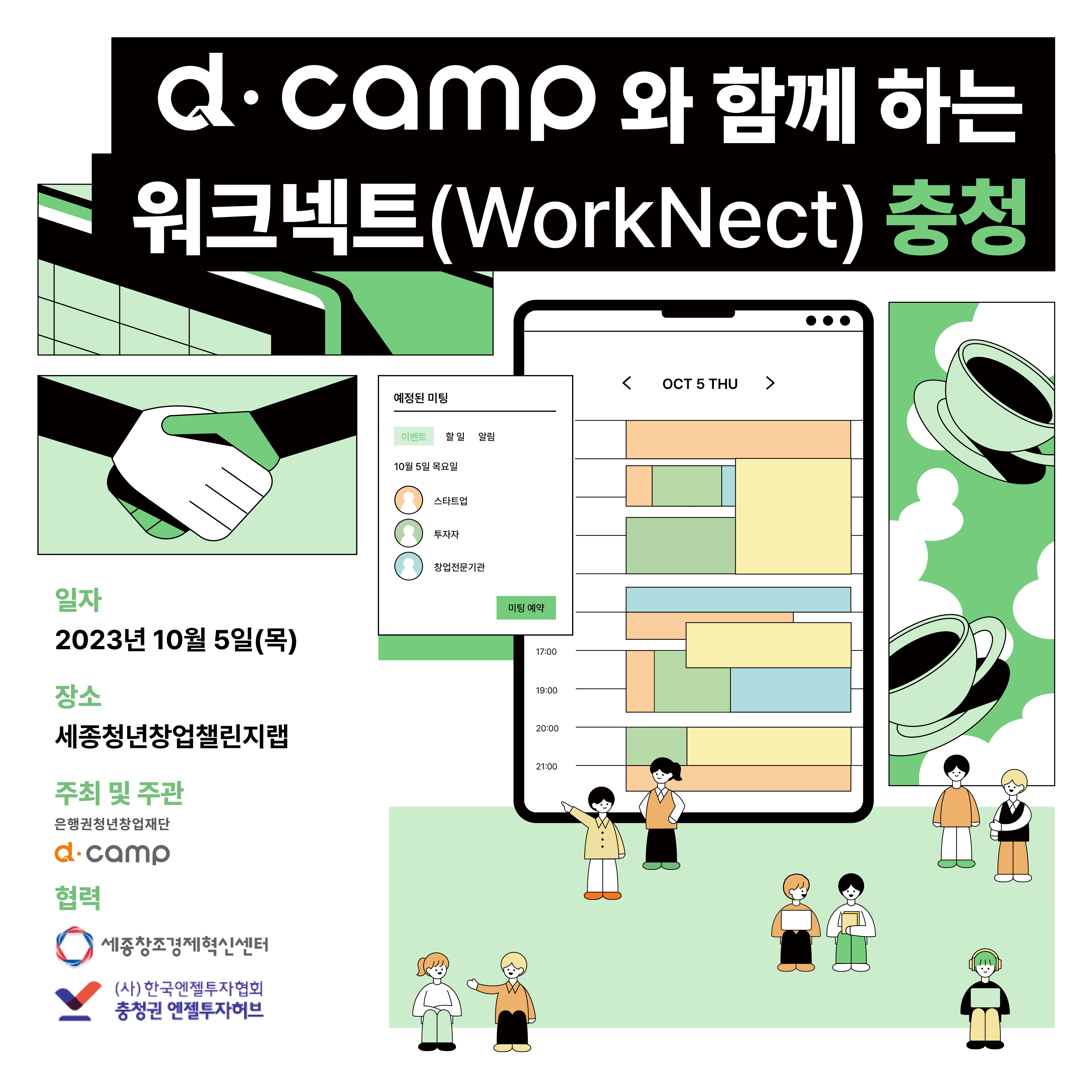 ※ d·camp와 함께하는 10월 충청 워크넥트(세종) - 평소에 만나고 싶었던 수도권 VC · 창업지원기관 관계자와 한 공간에서 근무하며 티타임해보세요! - '적극적으로 네트워킹할 Open Mind를 가진 팀'이라면 환영합니다. 완성된 사업계획서나 특출한 사업성과가 없더라도 편하게 이야기 나눌 수 있습니다. * 본 프로그램은 지역에서 하루동안 스타트업 생태계 관계자들과 함께 근무하며 미팅하는 자리입니다. - 공고문 | https://dcamp.kr/event/58751 - 신청 링크(~10/2,월 자정) | https://forms.gle/xjneCRViXP3LqJw58 ※ 프로그램 일정 - 10:00 ~ 11:00 : 프로그램 / 디캠프 소개, 참가자 자기소개(전원) - 11:00 ~ 12:00 : 자율근무 / 티타임 / 네트워킹 - 12:00 ~ 13:00 : 그룹 네트워킹(w.점심식사) - 13:00 ~ 17:00 : 자율근무 / 티타임 / 네트워킹 / 소그룹세션* - 17:00 ~ 20:00 : 자율 네트워킹(w.저녁식사)** * 소그룹세션은 15:00~16:00에 진행되며, 희망자에 한하여 참여합니다. ** 하루 동안 함께 일한 분들과 더 친해질 수 있는 기회, 저녁 네트워킹에도 참여하세요! 스타트업 생태계 관계자와 지역 관계자가 모두 모여 저녁 네트워킹을 진행합니다. 조금 더 편안한 분위기에서 인사하고, 사업 관련 고민도 나눠보세요. ※ 10월 세종에서 만날 수 있는 멘토/지원기관 - 디캠프 L 사업팀(신규 스타트업 발굴 및 지역협력) - VC (업데이트 중) L 인라이트벤처스 이승재 상무 - 창업지원기관 (업데이트 중) L 세종창조경제혁신센터 투자전략팀 L 한국엔젤투자협회 충청권엔젤투자허브