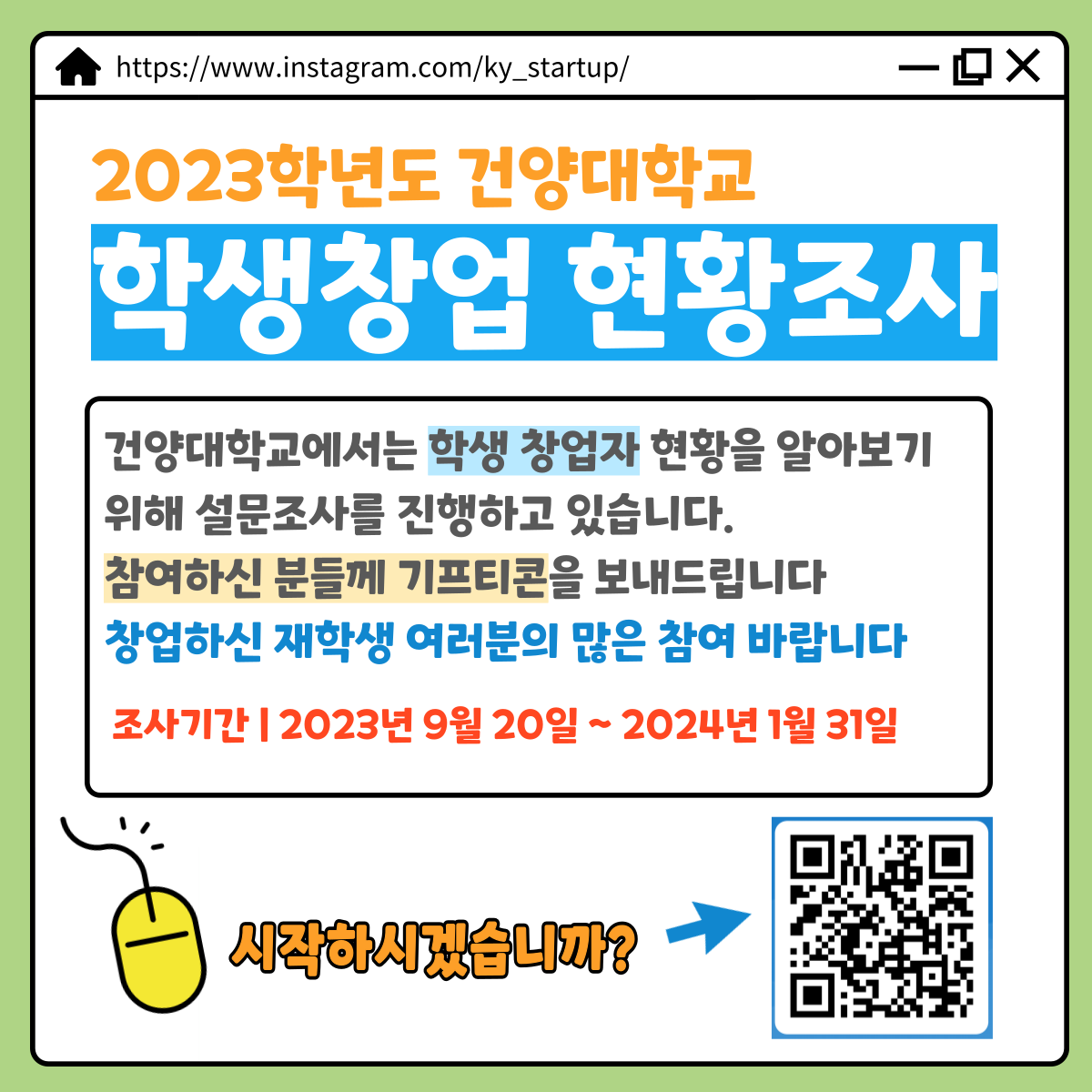 창업교육팀에서는 LINC3.0 및 정부 공시(대학 산학협력 활동 실태조사)등 지표관리 및 실전창업자 발굴 및 육성을 위해 아래와 같이「2023학년도 학생 창업 현황조사」를 진행하고자 합니다. 참여하신 분들께는 기프티콘을 발송해 드리니 창업하신 여러분들의 많은 참여 바랍니다. 1. 조사기간 : 2023. 9.20 ~ 2024. 1.31 2. 조사목적 : 창업지표 관리 및 실전창업자 발굴 및 육성 3. 조사대상 : 2023. 1. 1 이후 창업한 재학생 ※ 휴학생 및 졸업생(2022년 8월, 2023년 2월, 2023년 8월) 포함 4. 조사방법 : 구글 폼 온라인 조사(https://forms.office.com/r/Wb8sQQwYmq)