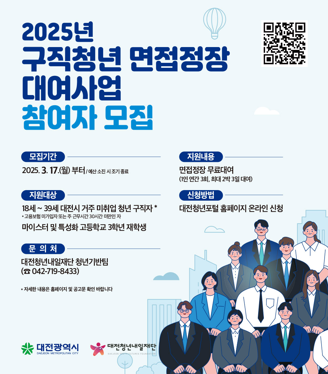 ㅇ 사 업 명: 2025년 구직청년 면접정장 대여사업 ㅇ 지원대상 - 18~39세 대전시 거주 미취업 청년 구직자 - 마이스터 및 특성화 고등학교 3학년 재학생 ㅇ 지원내용: 면접정장 무료대여(1인 연간 3회, 최대 2박 3일 대여) ㅇ 신청기간: 2025. 3. 17.(월) 부터 / 예산 소진시 조기 종료 ㅇ 신청방법: 대전청년포털 홈페이지(www.daejeonyouthportal.kr) 온라인 신청 ㅇ 문 의 처: 대전청년내일재단 청년기반팀 박세라(☎042-719-8433)